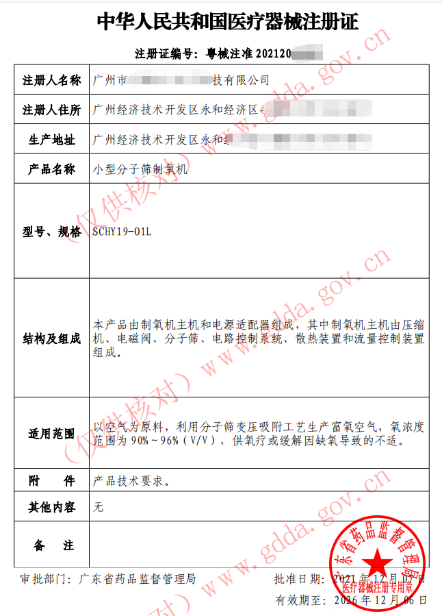 小型分子篩制氧機注冊證
